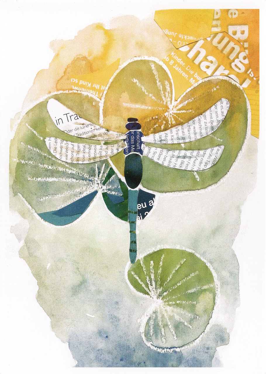 Diese kunstvolle Postkarte zeigt eine stilisierte Libelle in einer harmonischen Collage aus Aquarellflächen und feinen Papierelementen. Warme Gelb- und Grüntöne gehen sanft in kühlere Blau-Nuancen über und verleihen dem Motiv Leichtigkeit und Tiefe. Die Kombination aus transparenter Aquarelltechnik, sichtbaren Textfragmenten und zarten Konturen macht jede Libelle lebendig und modern zugleich. Eine besondere Postkarte für Naturliebhaber, Designaffine und alle, die einen poetischen, zeitlosen Gruß versenden möchten.
