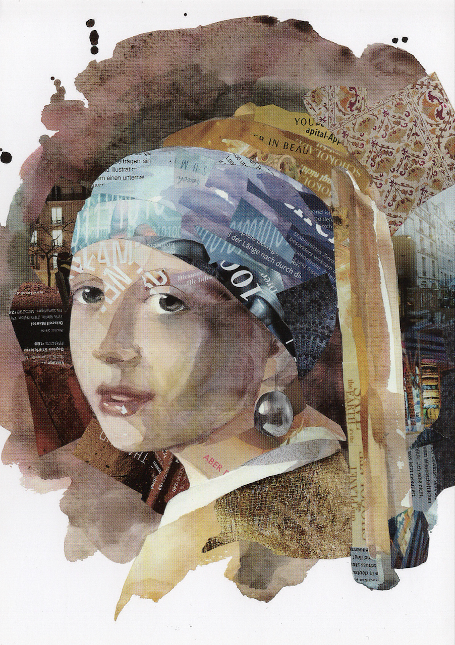 Künstlerische Collage-Postkarte im A6-Format, inspiriert vom klassischen Motiv des „Mädchens mit dem Perlenohrring“, neu interpretiert in einer modernen, urbanen Bildsprache. Das Porträt verbindet Fragmente aus Zeitungs- und Buchseiten, architektonische Stadtansichten sowie textile Muster zu einem vielschichtigen Kopfputz, der Vergangenheit und Gegenwart miteinander verwebt. Warme Erdtöne, sanfte Beige- und Braunnuancen sowie transparente Überlagerungen verleihen dem Motiv Tiefe und eine ruhige, nachdenkliche Ausstrahlung. Eine besondere Postkarte für Kunstliebhaberinnen und Kunstliebhaber, die klassische Ästhetik in zeitgenössischer Collageform schätzen.